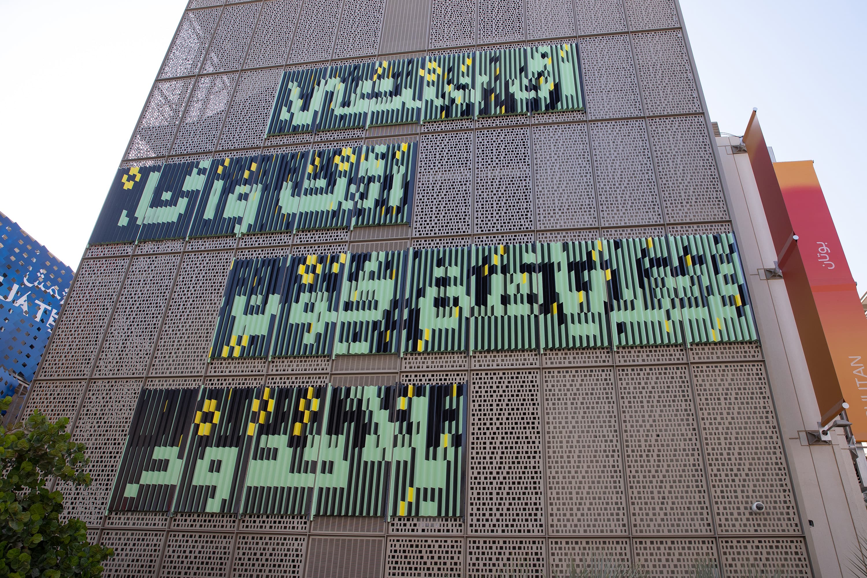 Lettering Large is collaboration between the US Mission to the UAE and the American University of Sharjah at Expo 2020 Dubai. The 125 square meter mural combines both Arabic and English typography in a lenticular design featuring the phrase You and I seek to forge a limited universe, written by Emirati author Eman Al Yousuf. We designed the English composition and the Arabic side was designed by UA designer Nada AlYafei. The design was on view in the EUA from October 14, 2021 to March 31, 2022.